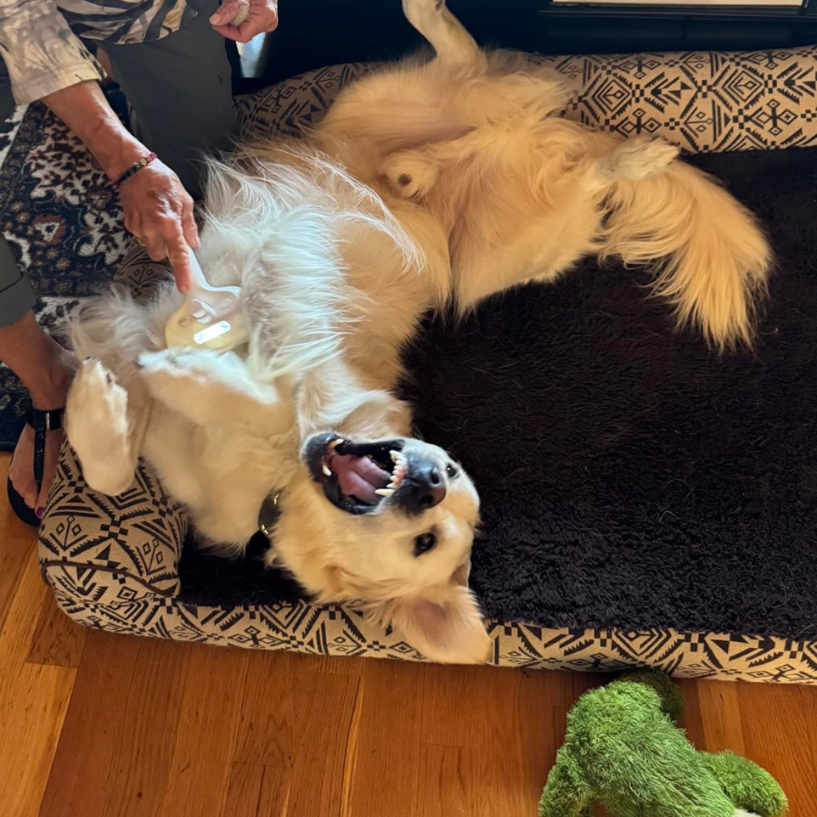 Jag var lite osäker först på om min hund skulle acceptera den, men det gick jättebra. Pälsen flyger inte runt överallt längre och borstningen går mycket snabbare. Han ligger lugnt kvar och verkar tycka det är skönt. Väldigt nöjd med köpet. -